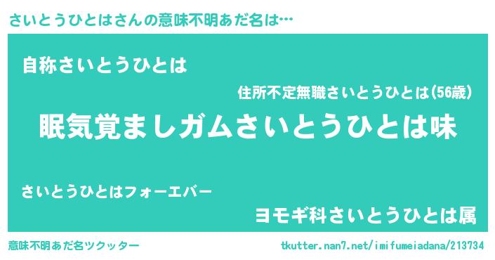 | 男性向けラノベタイトル風あだ名 | 『うちのさいとうひとはが世界を掌握している!』 |