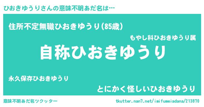 | 男性向けラノベタイトル風あだ名 | 『Re:ひおきゆうりから始める異世界生活』 |