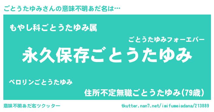 | 胡散臭い通販商品みたいなあだ名 | 『来世でも幸せになれる水素水…その名も「ごとうたゆみ」』 |