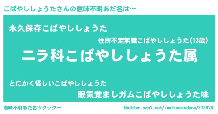 | 胡散臭い通販商品みたいなあだ名 | 『前代未聞の健康食品…その名も「こばやししょうた」』 |