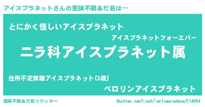 | 男性向けラノベタイトル風あだ名 | 『アイスプラネット~年齢イコール彼女いない歴の魔法使い~』 |