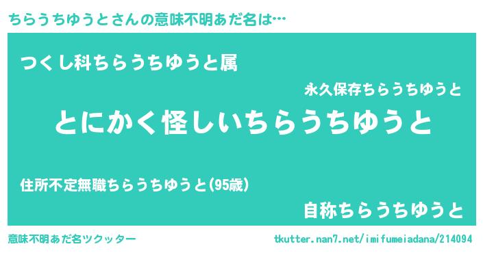 | 男性向けラノベタイトル風あだ名 | 『ちらうちゆうとの嫁は女の子じゃないと思った?』 |