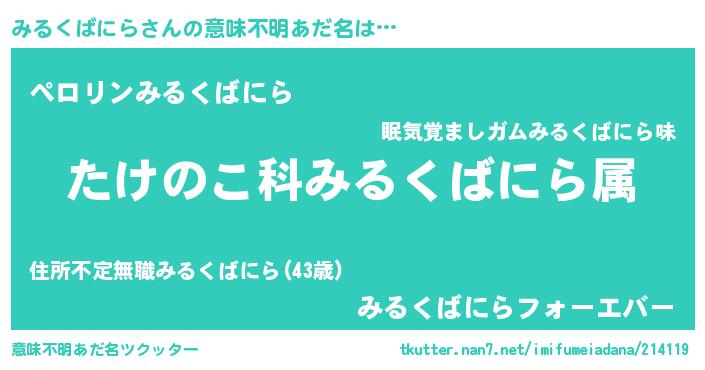 | 男性向けラノベタイトル風あだ名 | 『転生したらみるくばにらだった件』 |