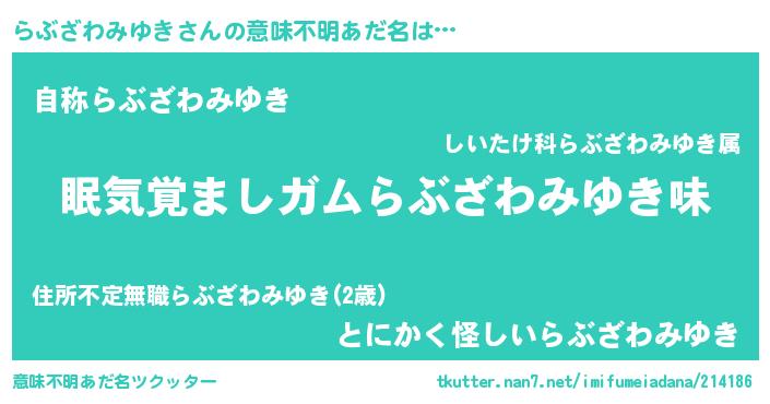 | 男性向けラノベタイトル風あだ名 | 『おまえをオタクにしてやるから、俺をらぶざわみゆきにしてくれ! 』 |