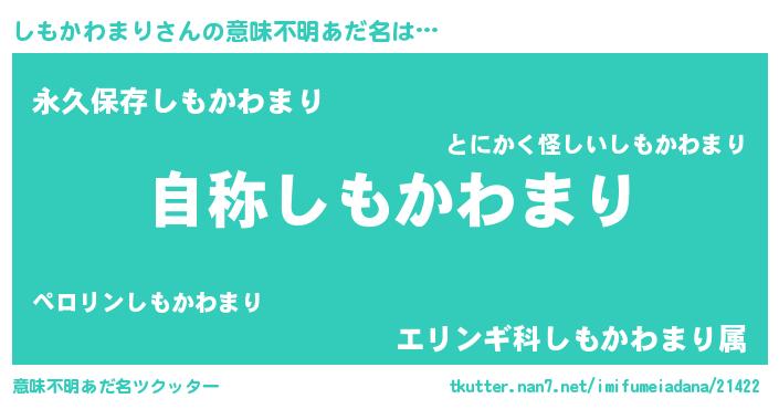 | 男性向けラノベタイトル風あだ名 | 『うちのしもかわまりが世界を掌握している!』 |