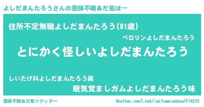 | 男性向けラノベタイトル風あだ名 | 『うちのよしだまんたろうが世界を掌握している!』 |