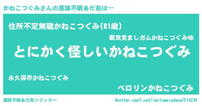 | 男性向けラノベタイトル風あだ名 | 『かねこつぐみの嫁は女の子じゃないと思った?』 |