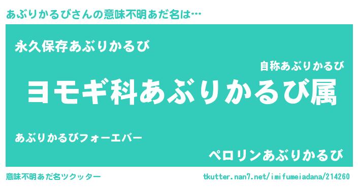 | ヘコむあだ名 | 『あぶりかるび(爆)』『あぶにゅー』 |