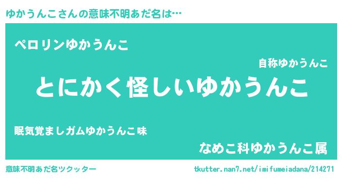 | 男性向けラノベタイトル風あだ名 | 『ゆかうんこの嫁は女の子じゃないと思った?』 |