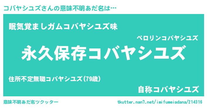 | 胡散臭い通販商品みたいなあだ名 | 『来世でも幸せになれる水素水…その名も「コバヤシユズ」』 |