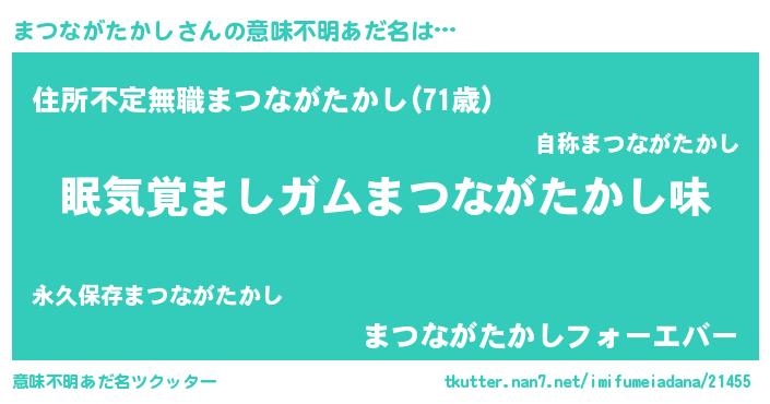 | 男性向けラノベタイトル風あだ名 | 『おまえをオタクにしてやるから、俺をまつながたかしにしてくれ! 』 |