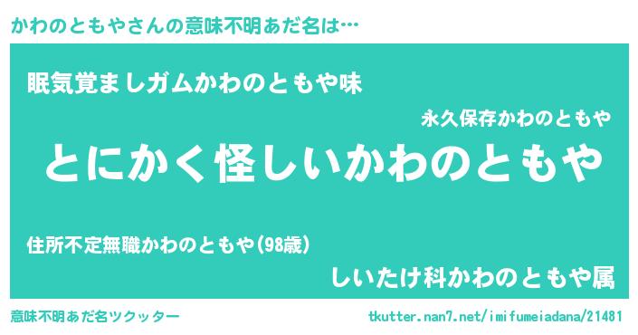 | 女子向けラノベタイトル風あだ名 | 『かわのともや様がみてる』 |