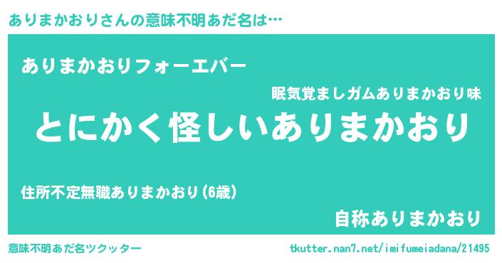 | 女子向けラノベタイトル風あだ名 | 『ありまかおりの卵を拾いまして』 |