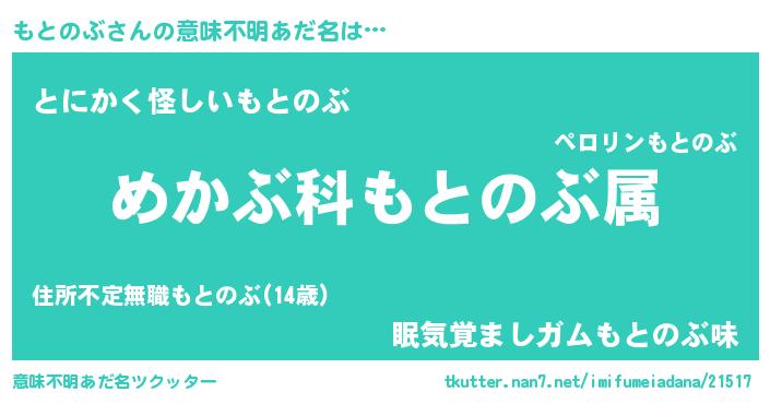 | 男性向けラノベタイトル風あだ名 | 『モトノブスレイヤー』 |