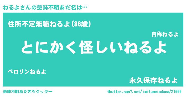 | 男性向けラノベタイトル風あだ名 | 『ねるよの嫁は女の子じゃないと思った?』 |
