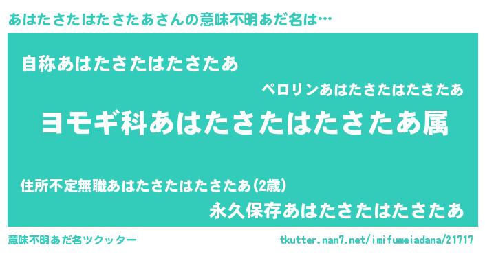 | 男性向けラノベタイトル風あだ名 | 『あはたさたはたさたあ~年齢イコール彼女いない歴の魔法使い~』 |