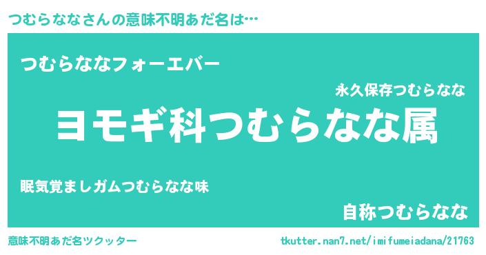 | 男性向けラノベタイトル風あだ名 | 『つむらなな~年齢イコール彼女いない歴の魔法使い~』 |