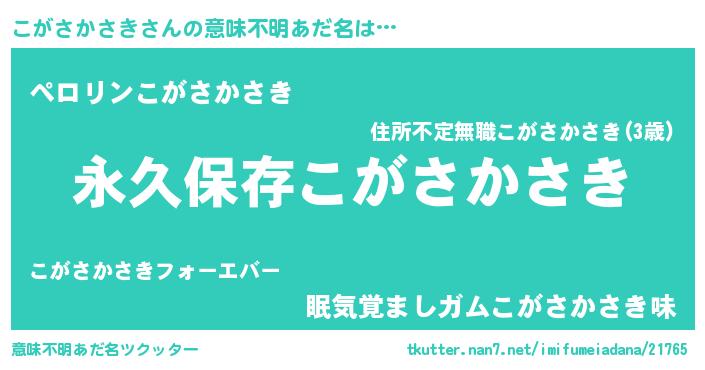 | 男性向けラノベタイトル風あだ名 | 『こがさかさきという概念が存在しない退屈な世界 』 |