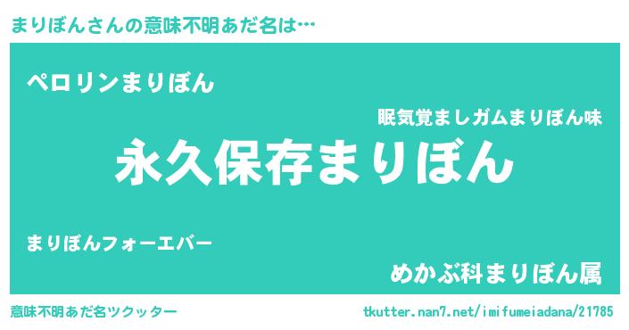 | 男性向けラノベタイトル風あだ名 | 『まりぼんに滅ぼされるだけの簡単なお仕事です』 |