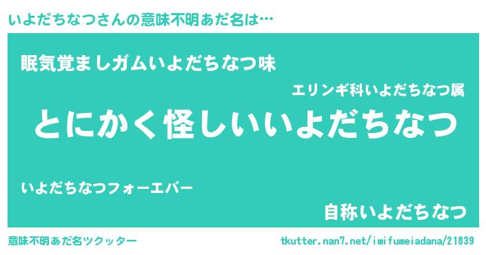 | 胡散臭い通販商品みたいなあだ名 | 『信頼と実績のサプリメント…その名も「いよだちなつ」』 |