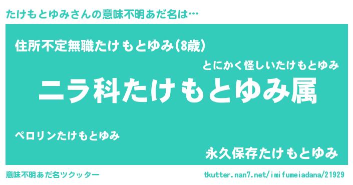 | ヘコむあだ名 | 『たけもとゆみ(笑)』『たけを』 |