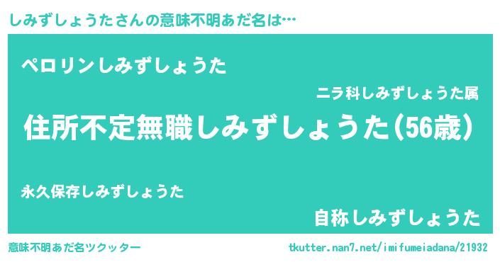 | ヘコむあだ名 | 『しみにゅー』『しみずしょうた(小並感)』 |