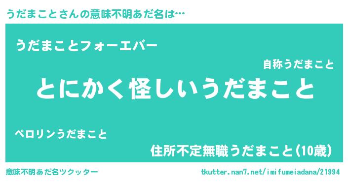 | 男性向けラノベタイトル風あだ名 | 『うちのうだまことが世界を掌握している!』 |