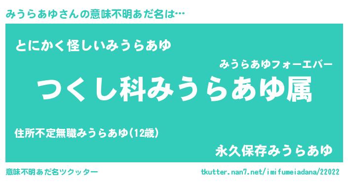 | 男性向けラノベタイトル風あだ名 | 『みうらあゆ~年齢イコール彼女いない歴の魔法使い~』 |