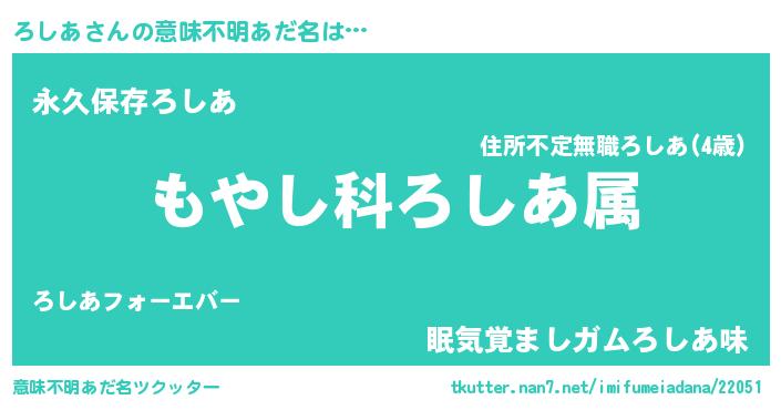 | ヘコむあだ名 | 『ろしあ(苦笑)』『豆乳』『ろしを』 |