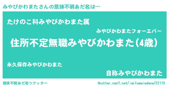 | ヘコむあだ名 | 『酢こんぶ』『みやびかわまた(小並感)』 |