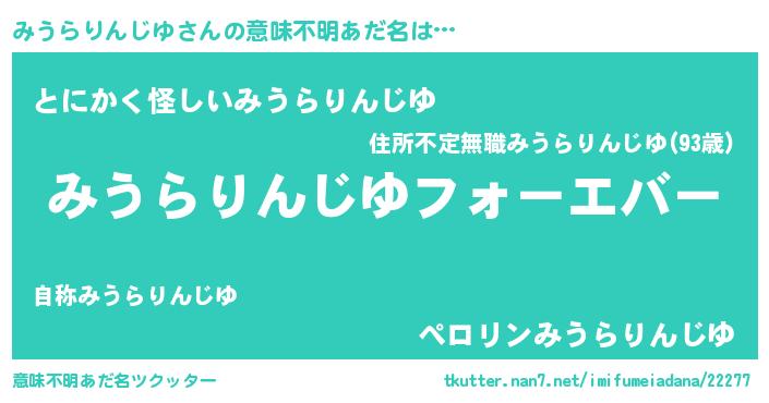 | 男性向けラノベタイトル風あだ名 | 『みうらりんじゆに滅ぼされるだけの簡単なお仕事です』 |