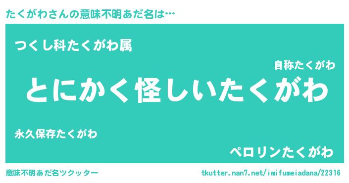 | 胡散臭い通販商品みたいなあだ名 | 『信頼と実績のサプリメント…その名も「たくがわ」』 |