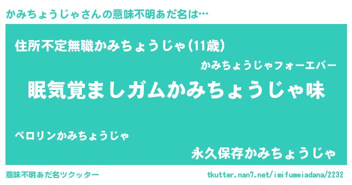 | 男性向けラノベタイトル風あだ名 | 『おまえをオタクにしてやるから、俺をかみちょうじゃにしてくれ! 』 |