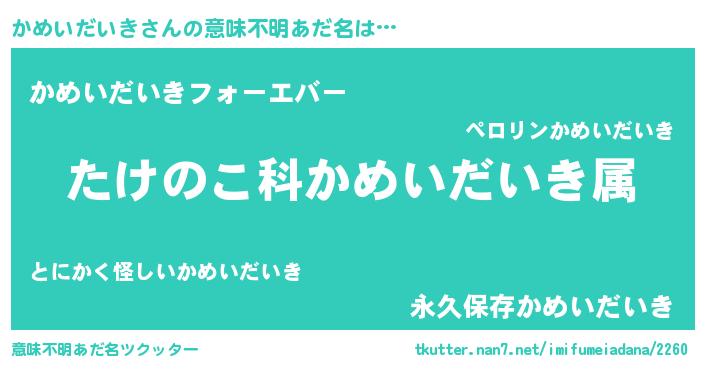 | 男性向けラノベタイトル風あだ名 | 『転生したらかめいだいきだった件』 |