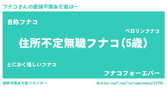 | 女子向けラノベタイトル風あだ名 | 『乙女ゲームの破滅フラグしかない悪役フナコに転生してしまった…』 |