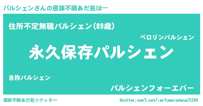 | 女子向けラノベタイトル風あだ名 | 『異世界で失敗しない100のパルシェン』 |