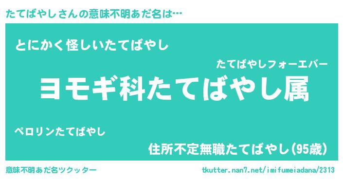 | 男性向けラノベタイトル風あだ名 | 『たてばやし~年齢イコール彼女いない歴の魔法使い~』 |