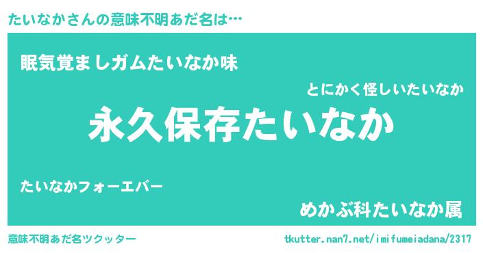 | 男性向けラノベタイトル風あだ名 | 『たいなかという概念が存在しない退屈な世界 』 |