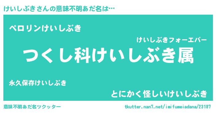 | 男性向けラノベタイトル風あだ名 | 『けいしぶき~年齢イコール彼女いない歴の魔法使い~』 |