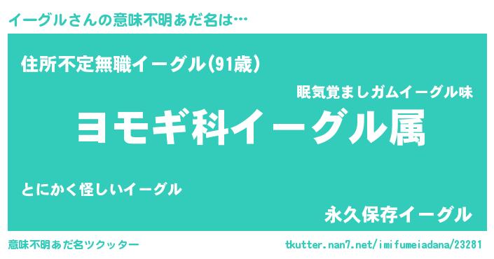 | 男性向けラノベタイトル風あだ名 | 『イーグル~年齢イコール彼女いない歴の魔法使い~』 |