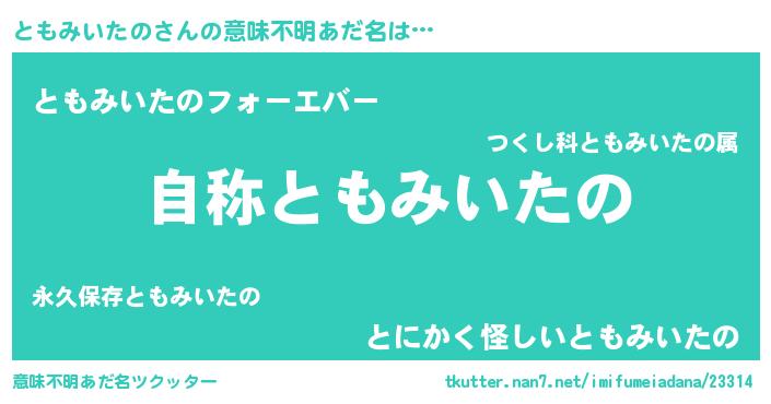 | 男性向けラノベタイトル風あだ名 | 『Re:ともみいたのから始める異世界生活』 |