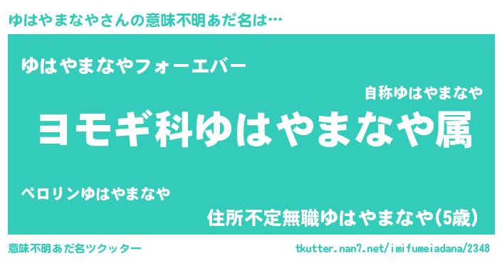 | 女子向けラノベタイトル風あだ名 | 『ゆはやまなやの玉の輿計画!』 |