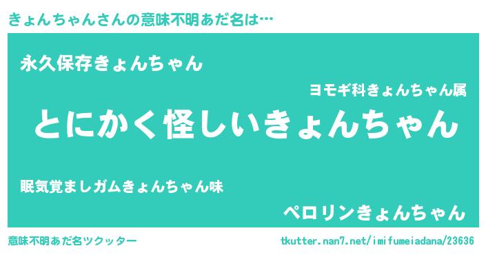 | 女子向けラノベタイトル風あだ名 | 『シンデレラきょんちゃん家の靴箱館』 |