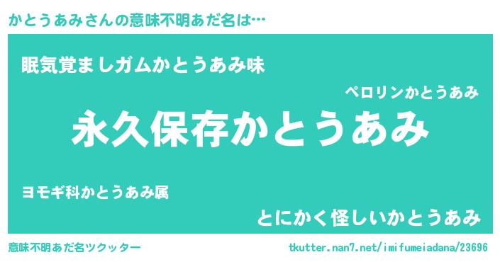 | 胡散臭い通販商品みたいなあだ名 | 『来世でも幸せになれる水素水…その名も「かとうあみ」』 |