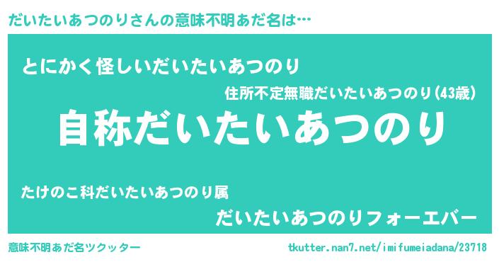 | 男性向けラノベタイトル風あだ名 | 『Re:だいたいあつのりから始める異世界生活』 |