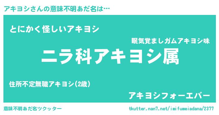 | ヒーロー風カッコイイあだ名 | 『炎刃騎士アキ』『ウルトラアキヨシマン』 |