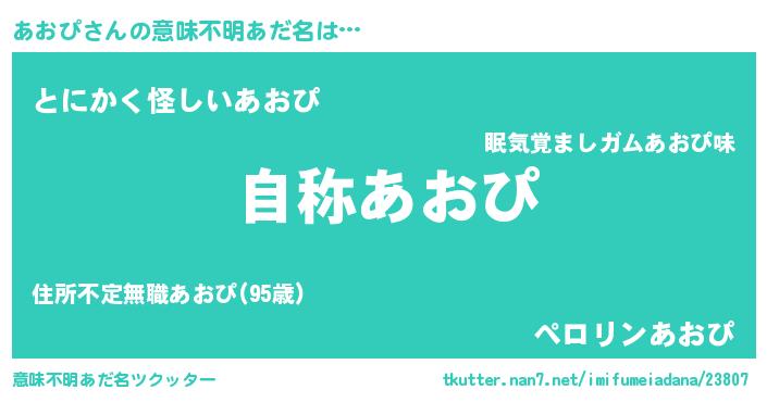 | 男性向けラノベタイトル風あだ名 | 『Re:あおぴから始める異世界生活』 |