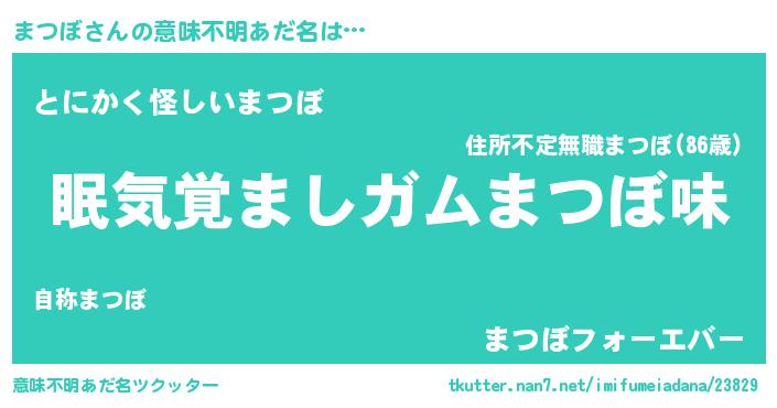 | 女子向けラノベタイトル風あだ名 | 『死神まつぼの再婚』『まつぼ伯爵の花嫁』 |