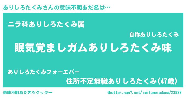 | 男性向けラノベタイトル風あだ名 | 『ノーゲーム・ノーアリシロタクミ』 |