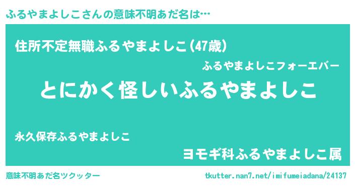 | 男性向けラノベタイトル風あだ名 | 『ふるやまよしこの嫁は女の子じゃないと思った?』 |